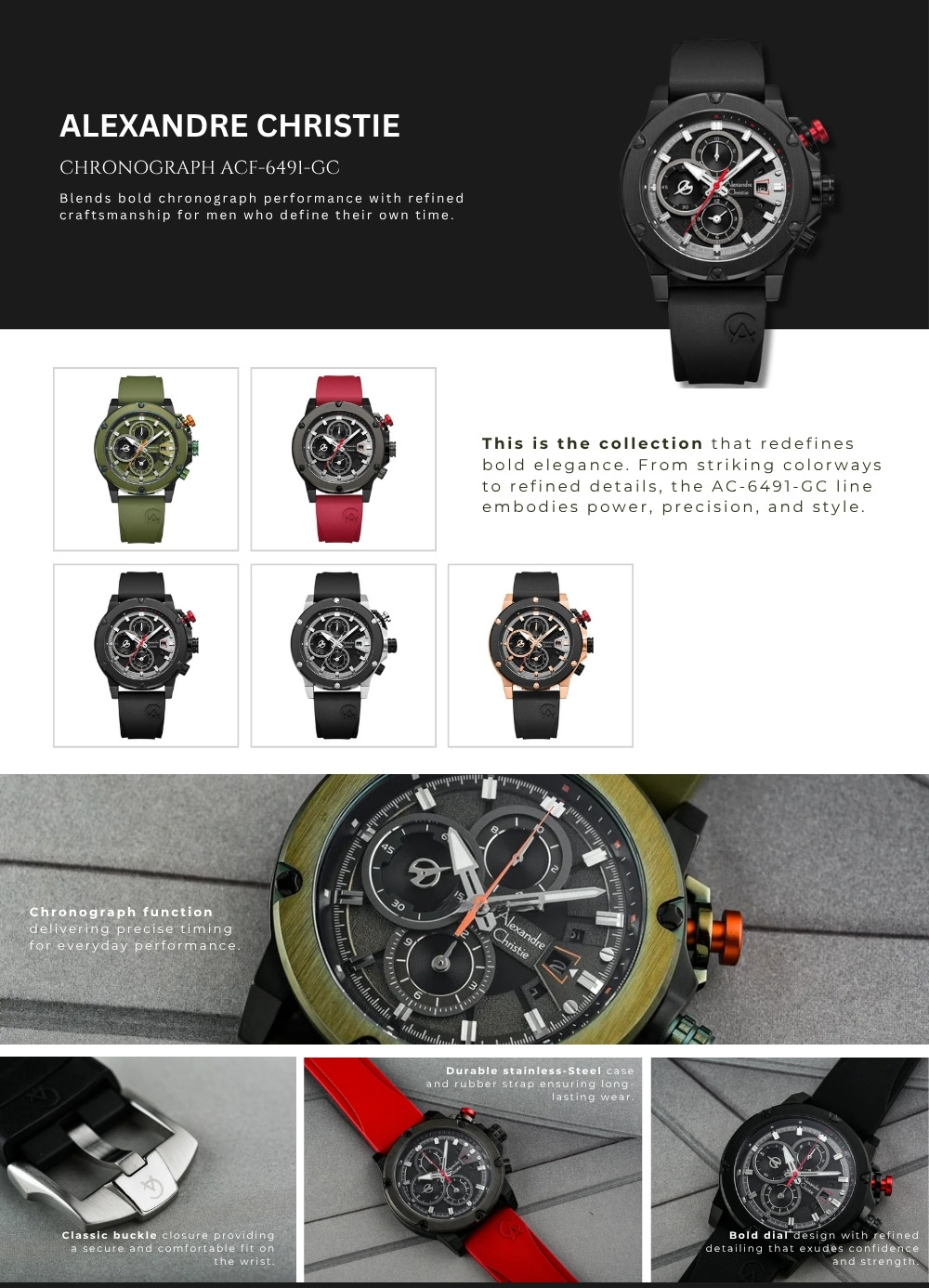 Setiap elemen dalam Alexandre Christie Chronograph ACF-6491-GCREPBARE dirancang untuk menonjolkan kekuatan dan ketepatan: