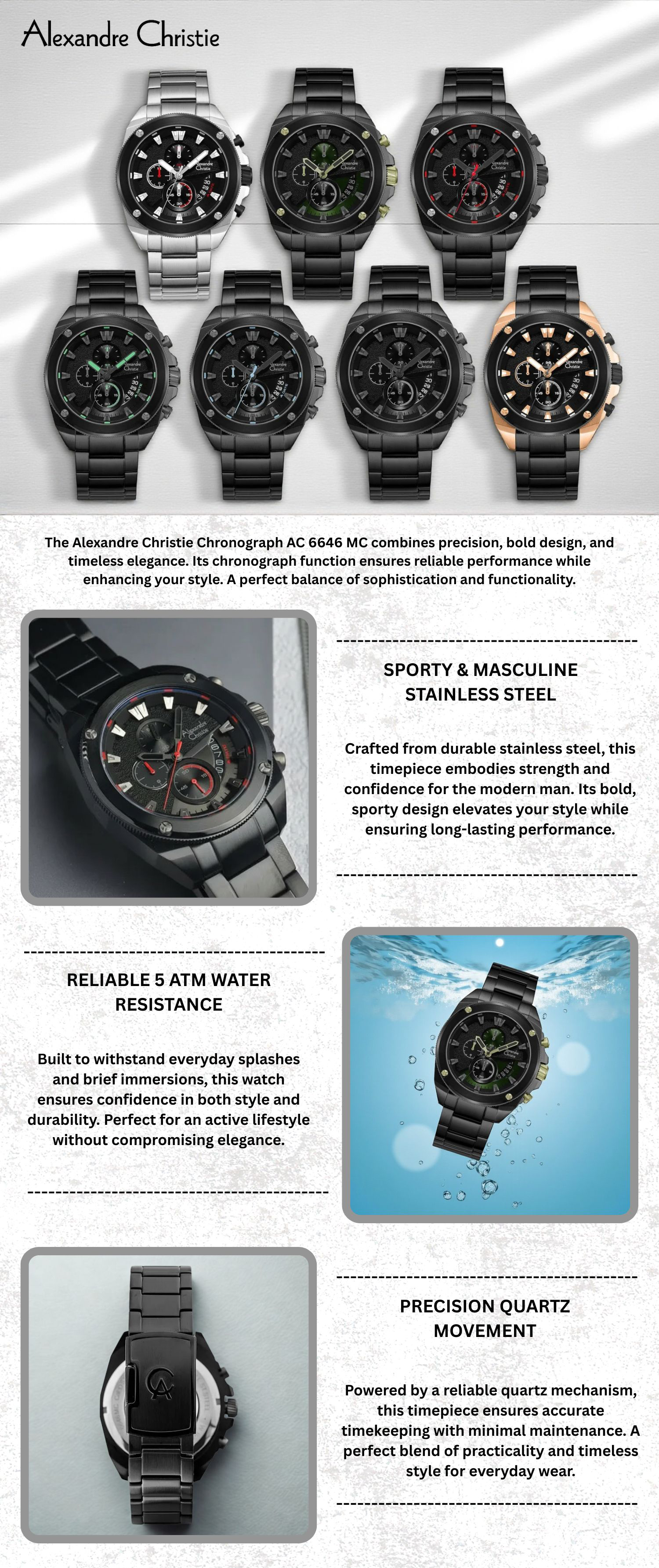 Alexandre Christie Chronograph AC 6646 MC dirancang untuk pria modern yang ingin tampil maskulin sekaligus elegan. Jam tangan ini tidak hanya menonjol dari segi desain, tetapi juga dibekali dengan fitur-fitur fungsional yang siap menemani aktivitas sehari-hari maupun momen spesial.