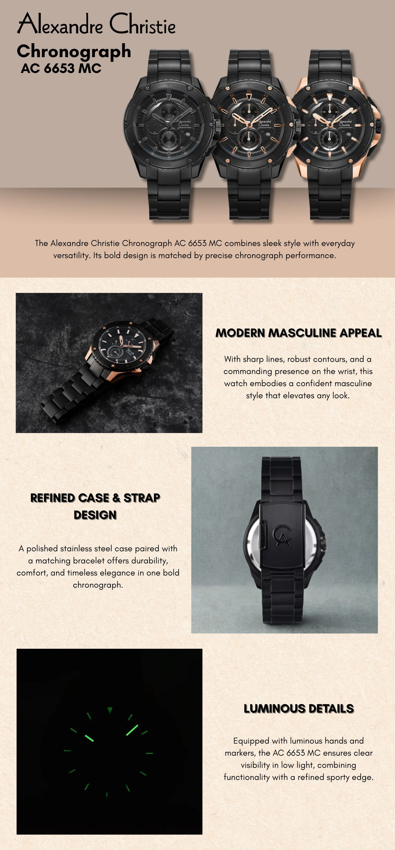 Tampil elegan sekaligus sporty dengan Alexandre Christie Chronograph AC 6653 MC. Jam tangan ini memadukan desain maskulin dengan fungsi chronograph yang andal untuk gaya dan aktivitas sehari-hari.