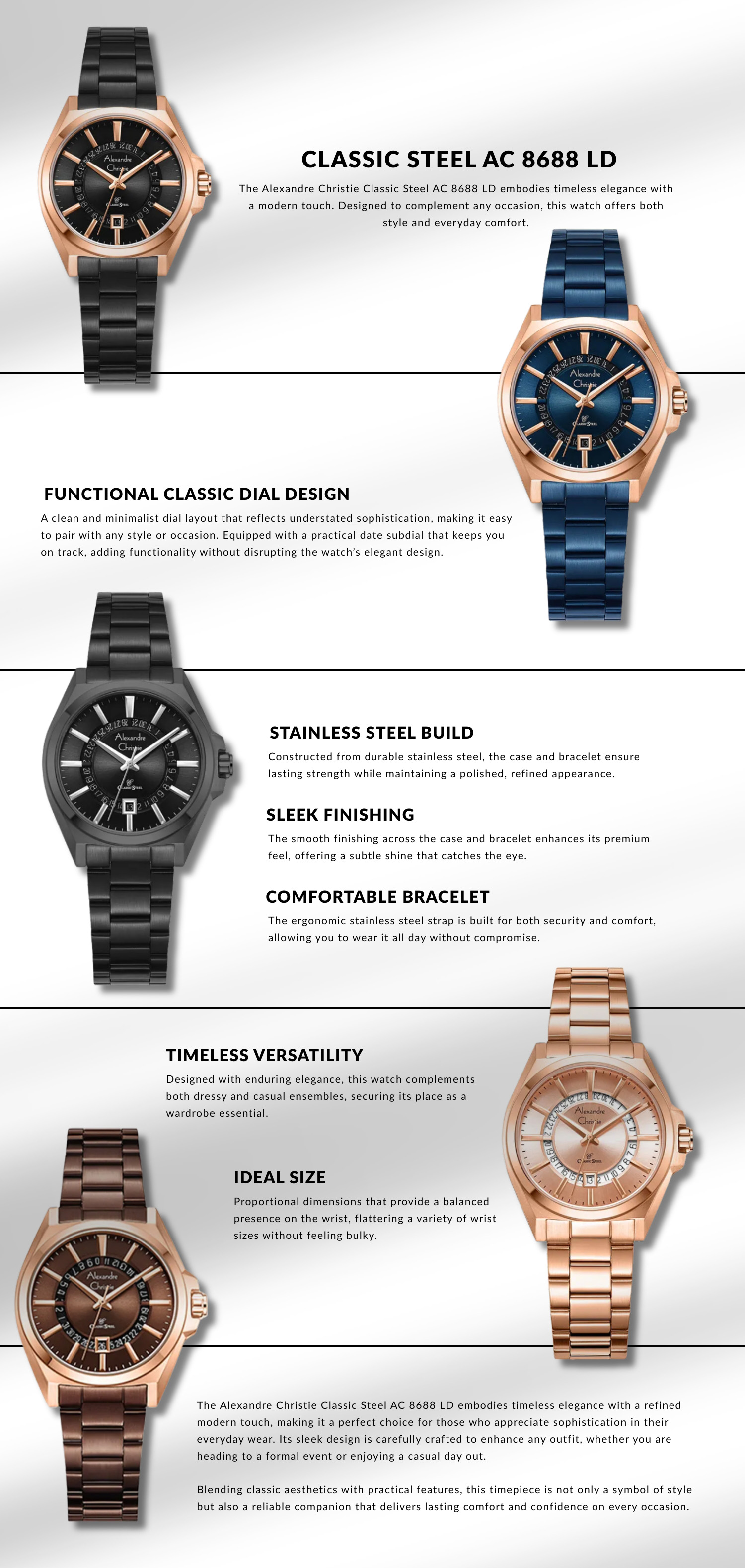 Untuk melengkapi penampilan dan kebutuhan Anda, Alexandre Christie Classic Steel ACF-8688-LDBBRBA dibekali dengan berbagai keunggulan berikut: