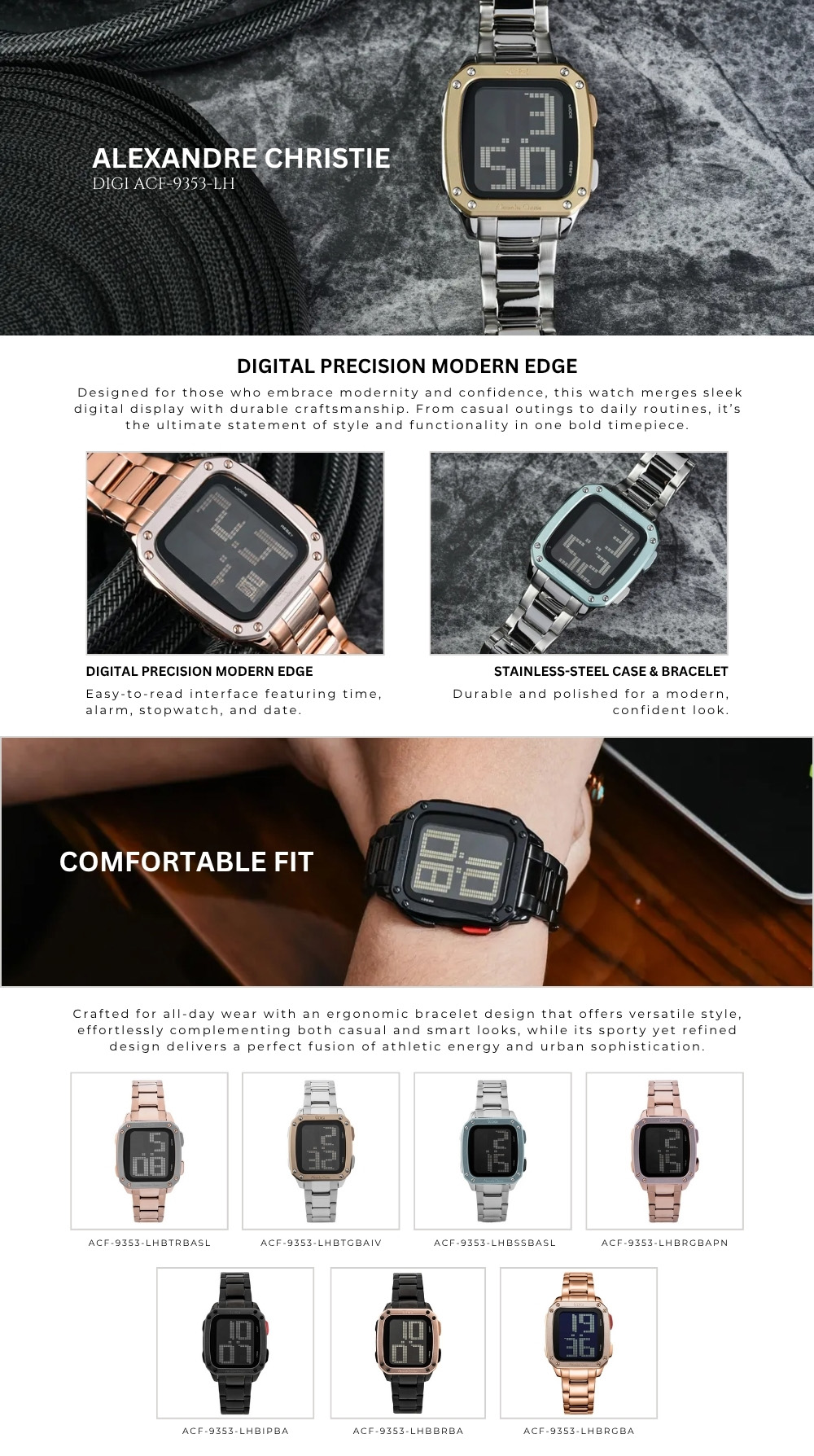 Dengan perpaduan fungsi digital dan tampilan bergaya modern, ACF-9353-LHBBRBA menjadi pilihan tepat bagi mereka yang menginginkan jam tangan praktis tanpa meninggalkan sisi stylish.