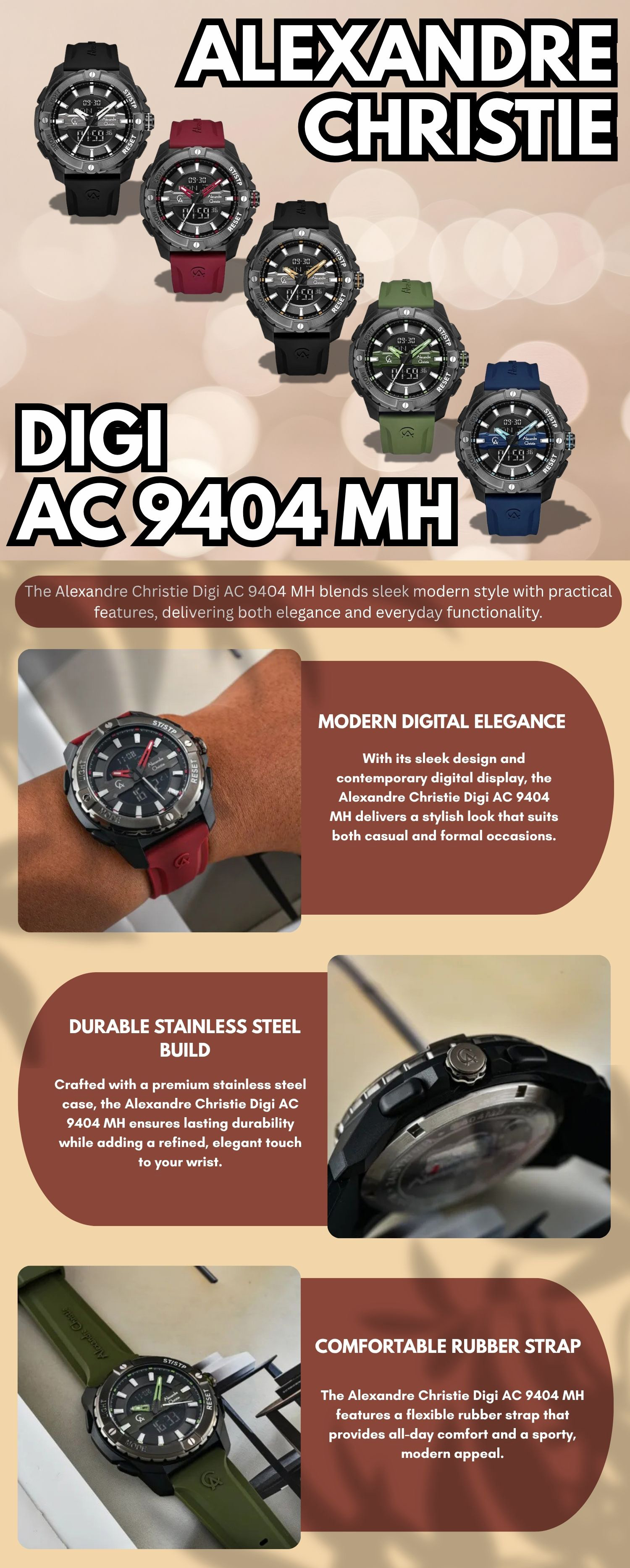 Alexandre Christie Digi AC 9404 MH hadir dengan tampilan modern yang memadukan gaya digital dan analog dalam satu jam tangan. Tidak hanya tampil stylish, jam ini juga dibekali berbagai fitur fungsional untuk menunjang aktivitas sehari-hari.