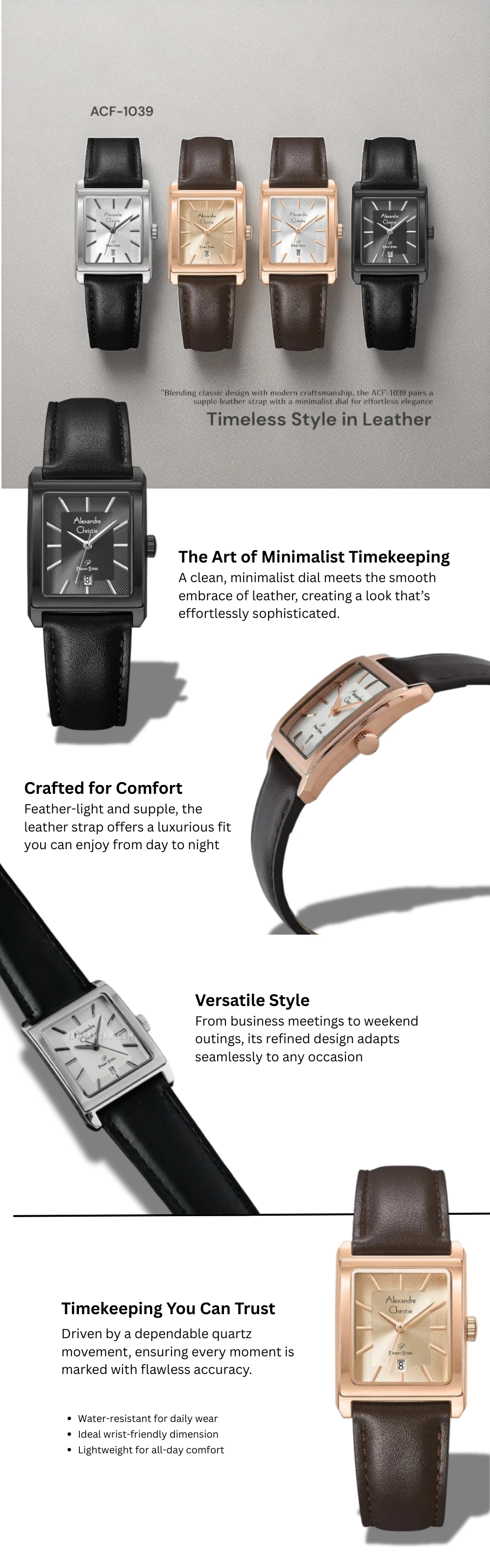 Alexandre Christie Primo ACF-1039-LDLSSSL hadir dengan desain kotak “tank” klasik-elegan dan dipadukan leather strap klasik yang beri kesan elegan. Memiliki dimensi ideal yang siap beri kenyamanan, koleksi ini adalah pilihan tepat untuk gaya formal maupun casual.