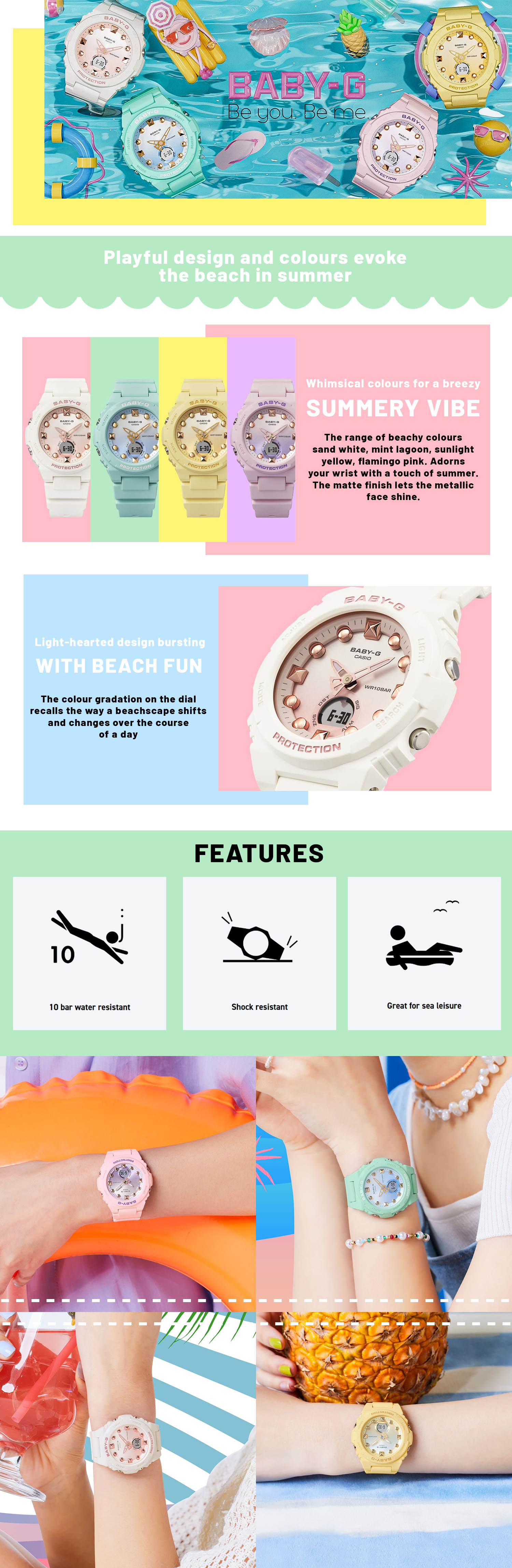 Bawa nuansa pantai ke dalam gaya kamu dan mulai musim panasmu dengan penuh semangat! Dapatkan Baby-G BGA-320-7A1JF sekarang juga hanya di Jamtangan.com!
