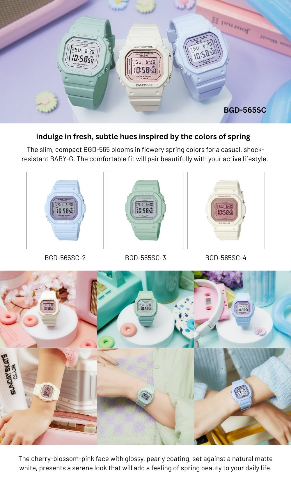 Baby‑G BGD‑565SC Spring Color menghadirkan koleksi dengan estetika warna spring‑inspired yang lembut dan feminin, dipadukan dimensi ringkas dan nyaman dipakai. Koleksi ini cocok untuk pemakaian setiap hari sekaligus memberikan sentuhan gaya yang menarik pada outfit kasual.