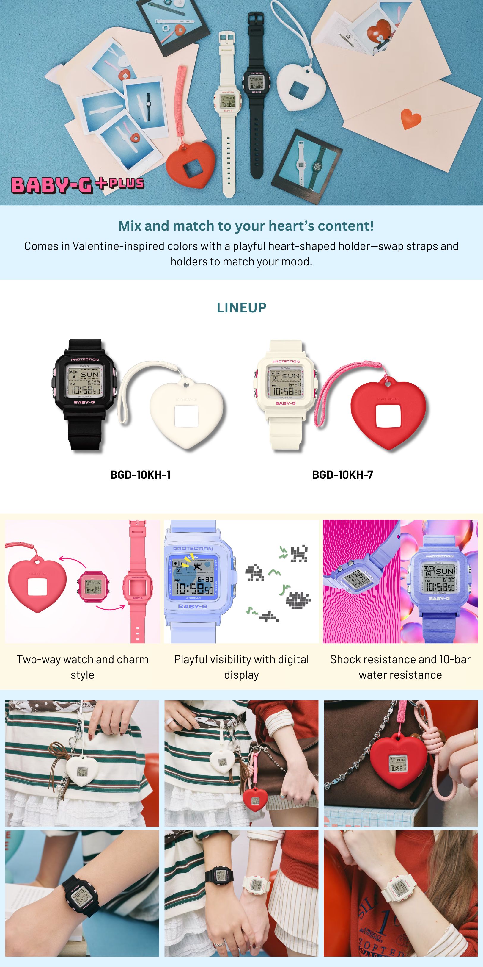 Tampil playful tapi tetap stylish dengan Baby-G BGD-10KH-1JR, jam tangan digital yang memadukan gaya dan fungsi dalam satu desain unik. Koleksi ini menghadirkan konsep “2 WAY Style”, di mana jam bisa dipakai di pergelangan tangan atau dijadikan charm lucu di tas lewat strap-holder berbentuk hati.