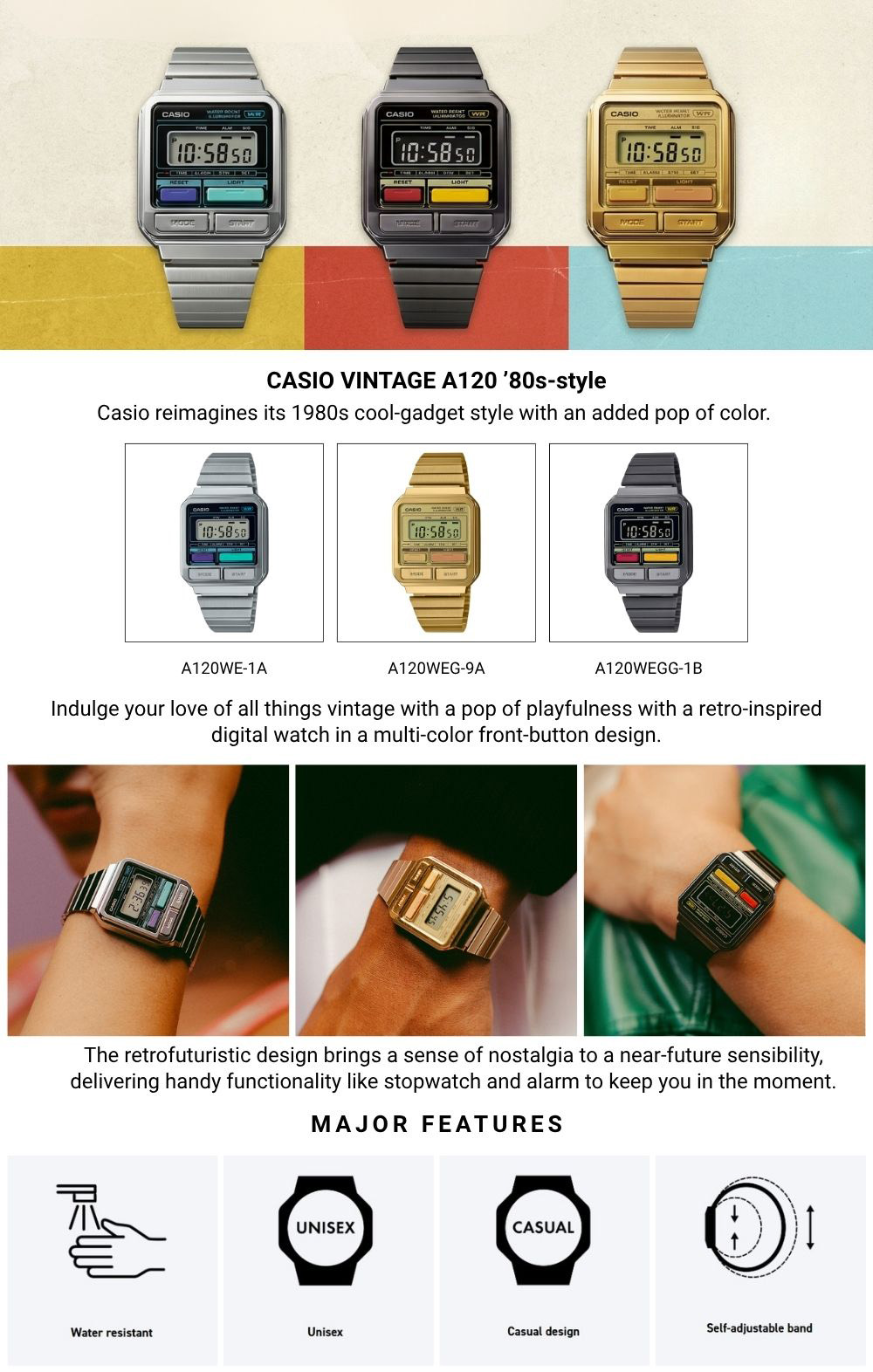 Tampil playful, nostalgic, dan tetap fungsional bersama koleksi Casio A120WE, pilihan tepat untuk gaya vintage yang standout. Check out sekarang dengan harga terbaik hanya di Jamtangan.com!