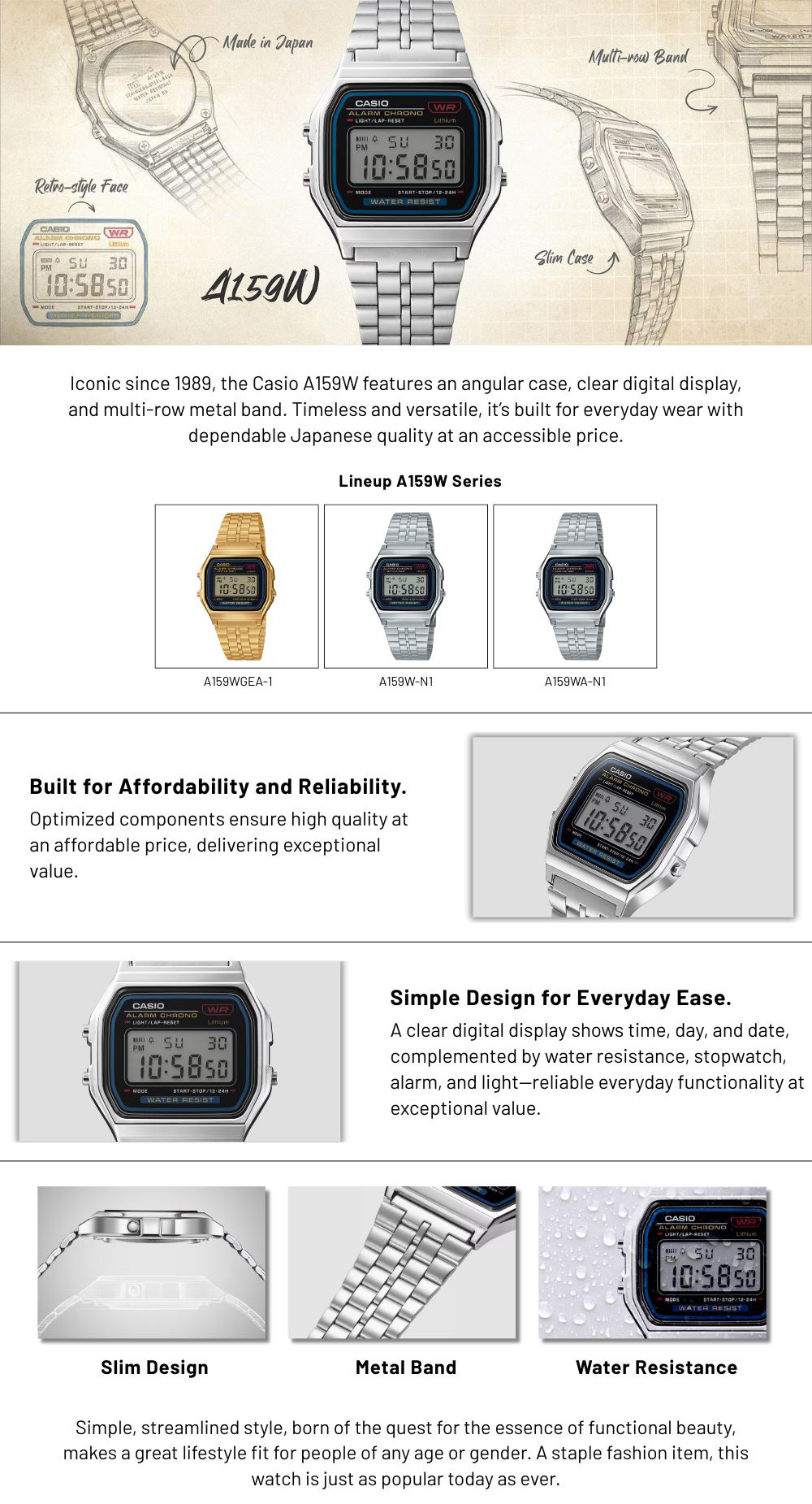 Tak hanya soal tampilan, setiap detail koleksi Casio A159W dirancang untuk menghadirkan fungsi esensial yang praktis dan mudah digunakan: