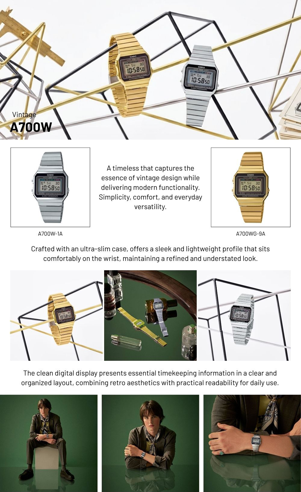 Koleksi Casio Vintage A700W hadir dengan desain digital klasik bergaya vintage yang juga menciptakan tampilan yang timeless dan standout. Case ultra slim dengan dial minimalis memberikan kesan clean, ringan, dan nyaman digunakan untuk aktivitas sehari-hari, baik kasual maupun semi-formal.