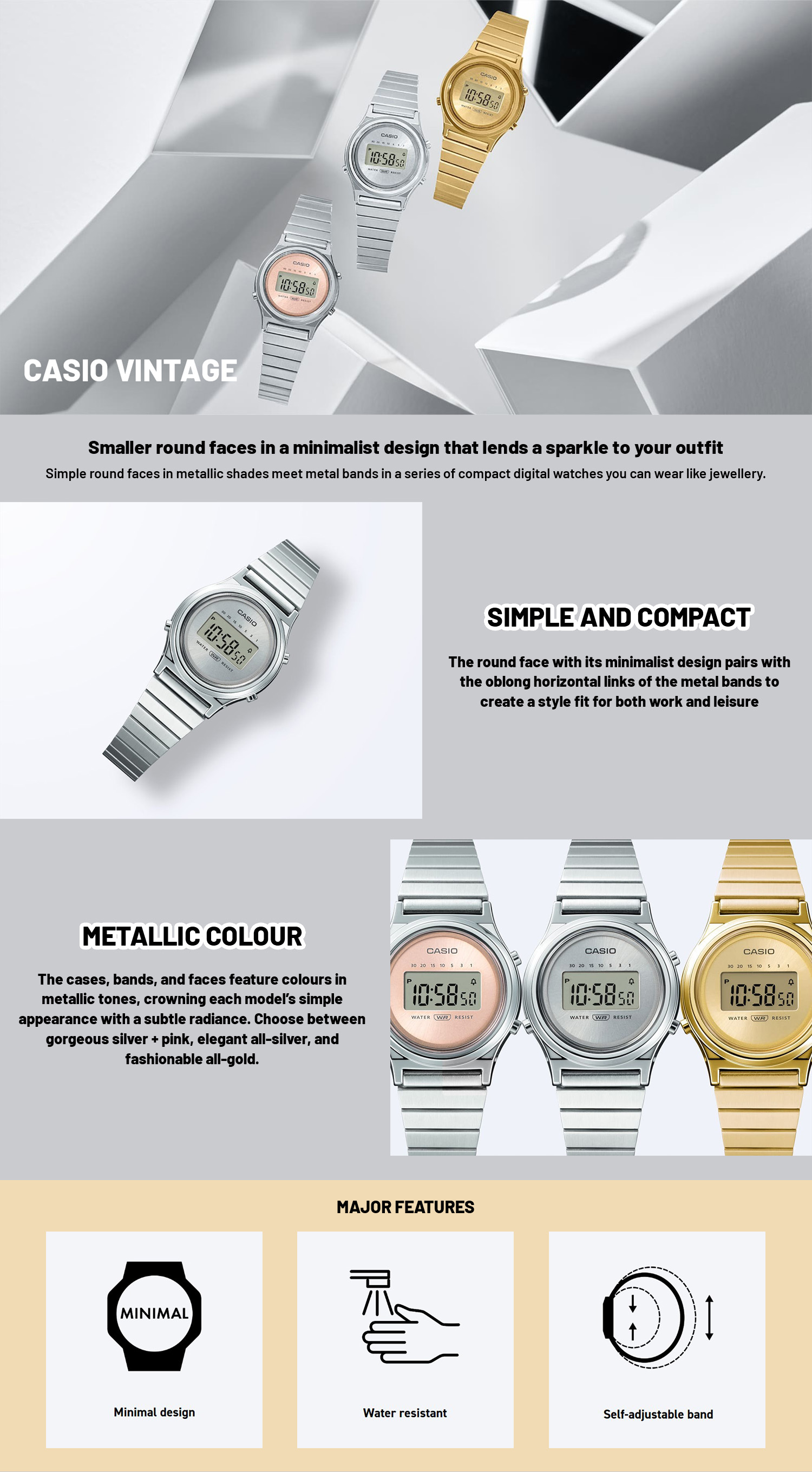 Tampil makin bersinar dengan Casio LA700WE-4AEF Vintage, jam tangan bergaya klasik yang dikemas dalam desain minimalis dan feminin. Ukurannya yang mungil, kilau dial yang elegan, dan fitur fungsional menjadikannya pilihan sempurna untuk kamu yang ingin tampil simpel tapi tetap standout.
