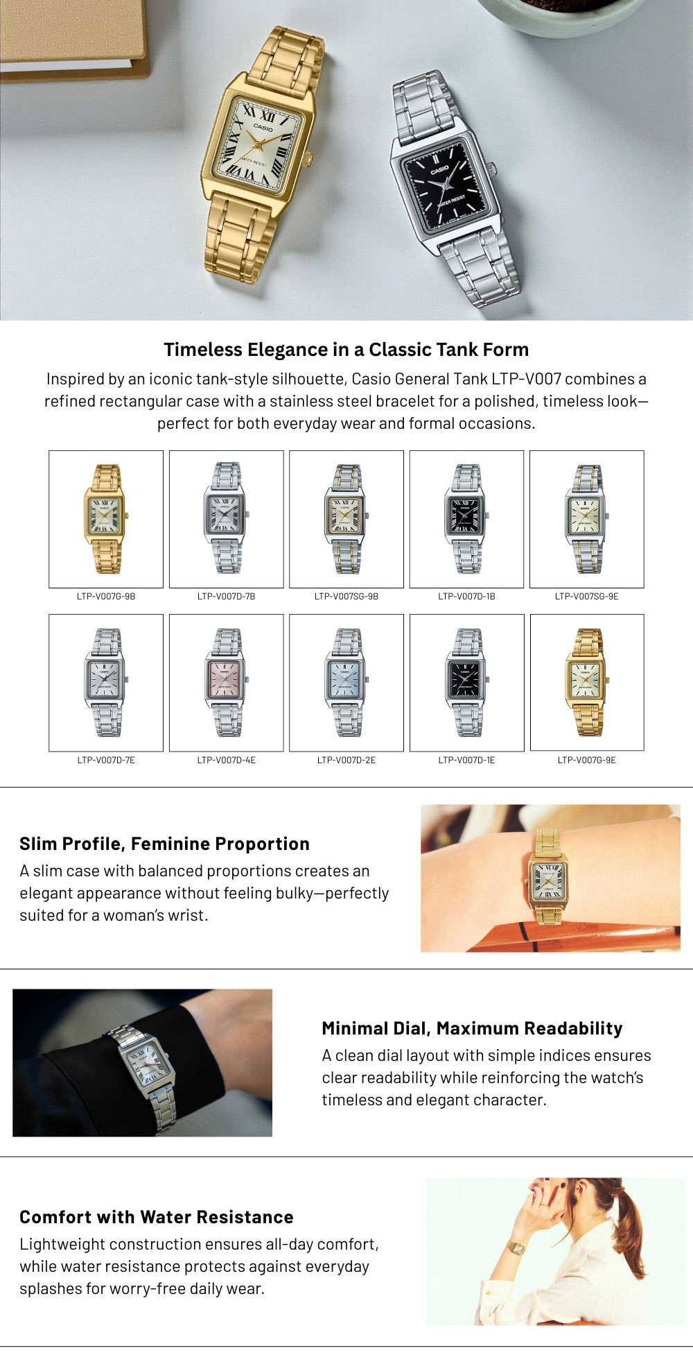 Keunggulan utama yang menjadikan Casio General Tank LTP-V007 pilihan elegan untuk gaya modern wanita: