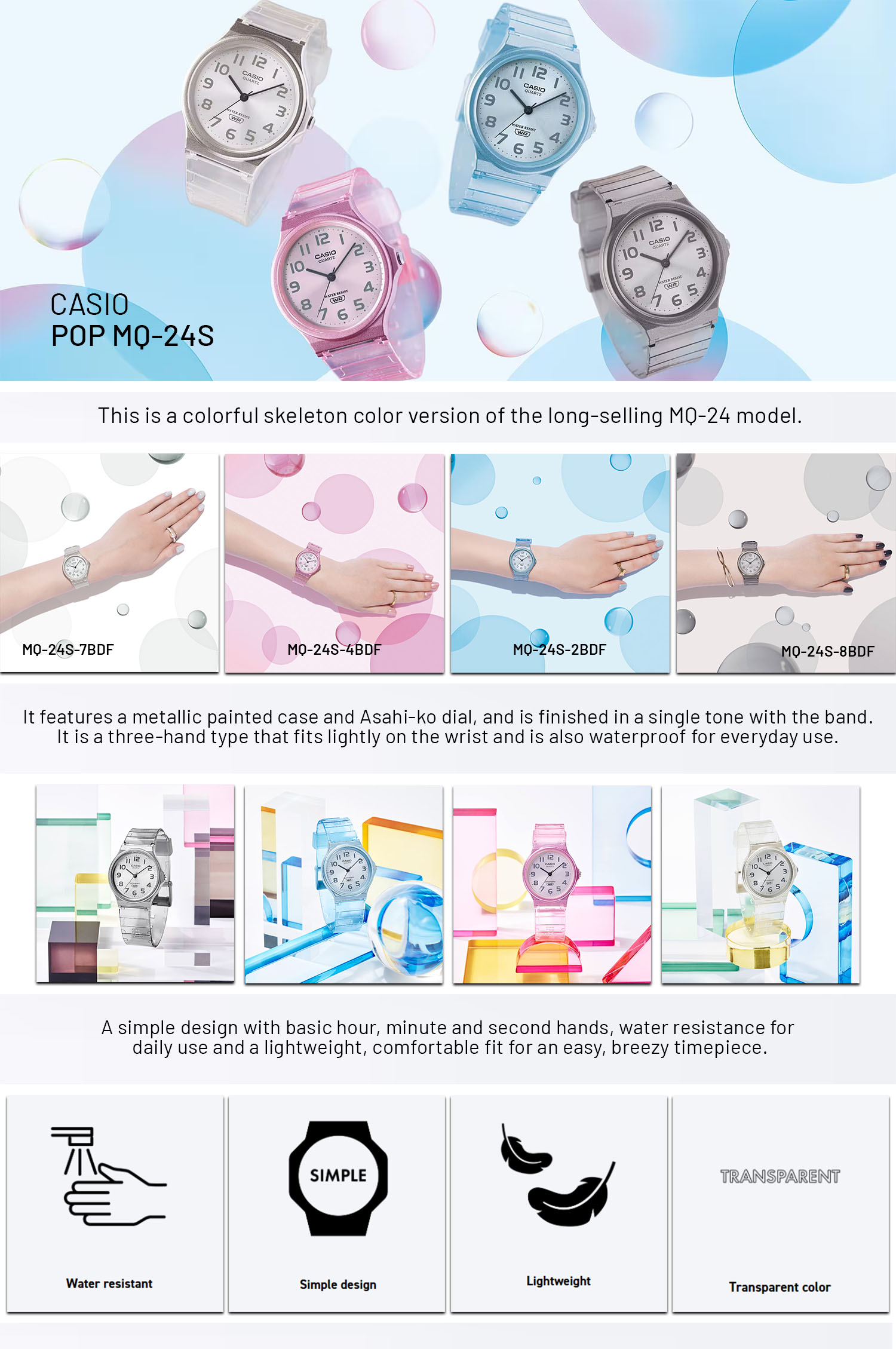 Menghadirkan tone warna yang refreshing, Casio MQ-24S-2BDF tampil memukau dengan resin transparan. Dial sunburst dan jarum analog sederhana semakin memancarkan kesan ceria. Kombinasi ini menciptakan jam tangan stylish yang mudah dipadu-padankan dengan gaya kasual.