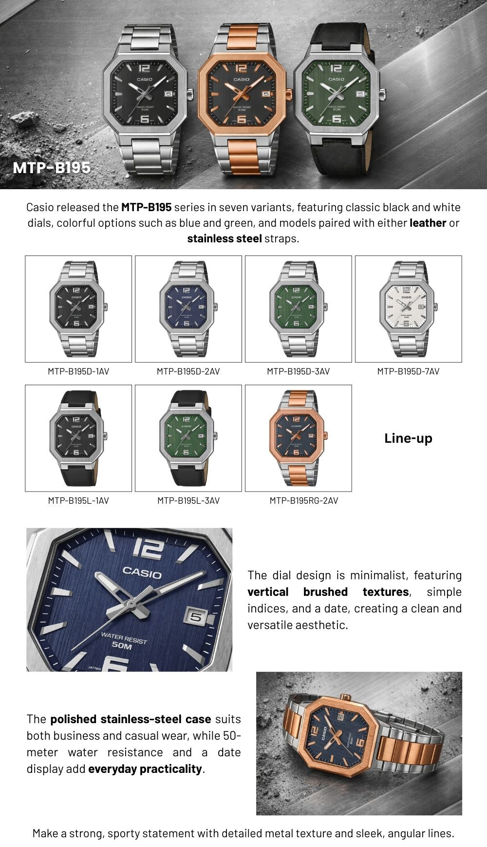 Casio Standard MTP-B195L Series menghadirkan desain modern dengan bezel geometris yang memberi karakter bold namun tetap minimalis. Dipadukan dengan leather strap klasik, jam ini tampil elegan dan versatile untuk melengkapi gaya formal maupun kasual sehari-hari.