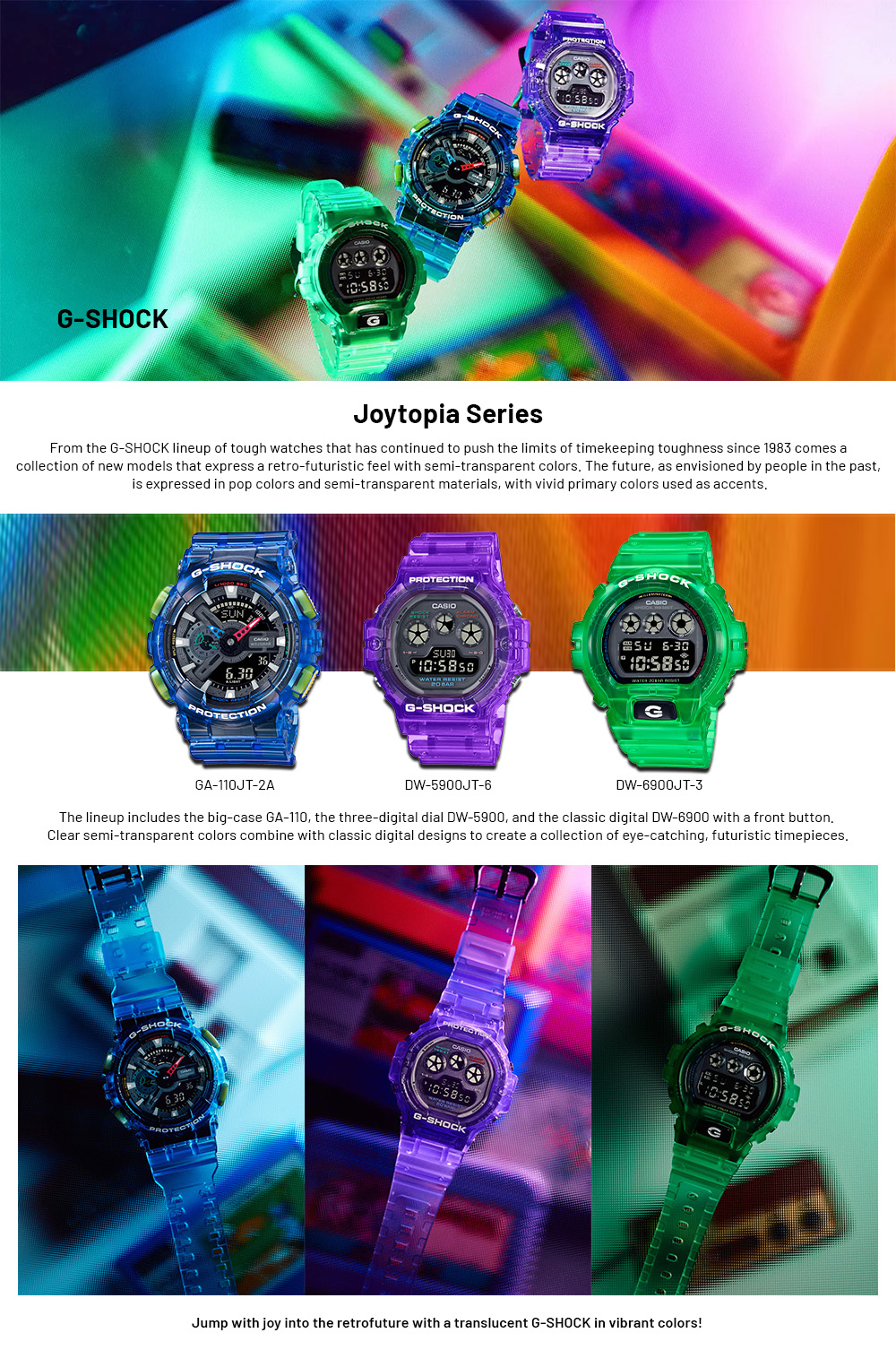 Dengan desain futuristik-retro yang penuh warna serta fitur tangguh khas G-Shock, DW-6900JT-3DR adalah pilihan sempurna untuk menghadapi aktivitas penuh energi. Check out hanya di Jamtangan.com!
