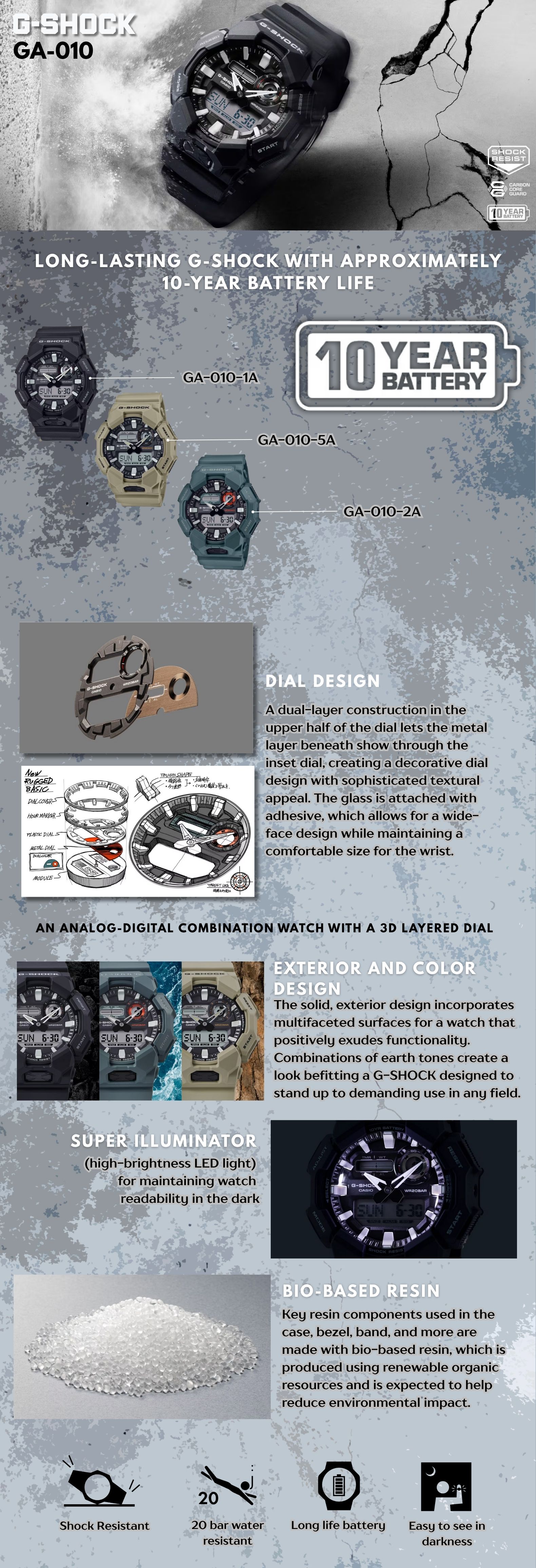 • 1x Casio G-Shock GA-010-5ADR New Rugged Basic Analog Digital Black Dial Beige Resin Band