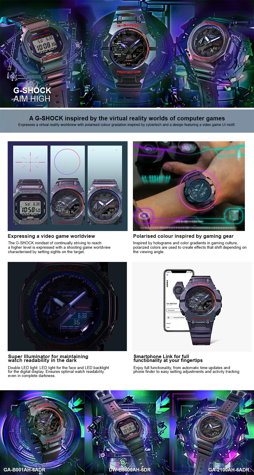 G-Shock GA-B001AH-6ADR Aim High Series hadir sebagai simbol keberanian untuk melampaui batas. Dengan desain futuristik dan fitur tangguh khas G-Shock, koleksi ini  menjadi pernyataan gaya sekaligus alat andal dalam menghadapi tantangan baik di dunia nyata maupun digital.