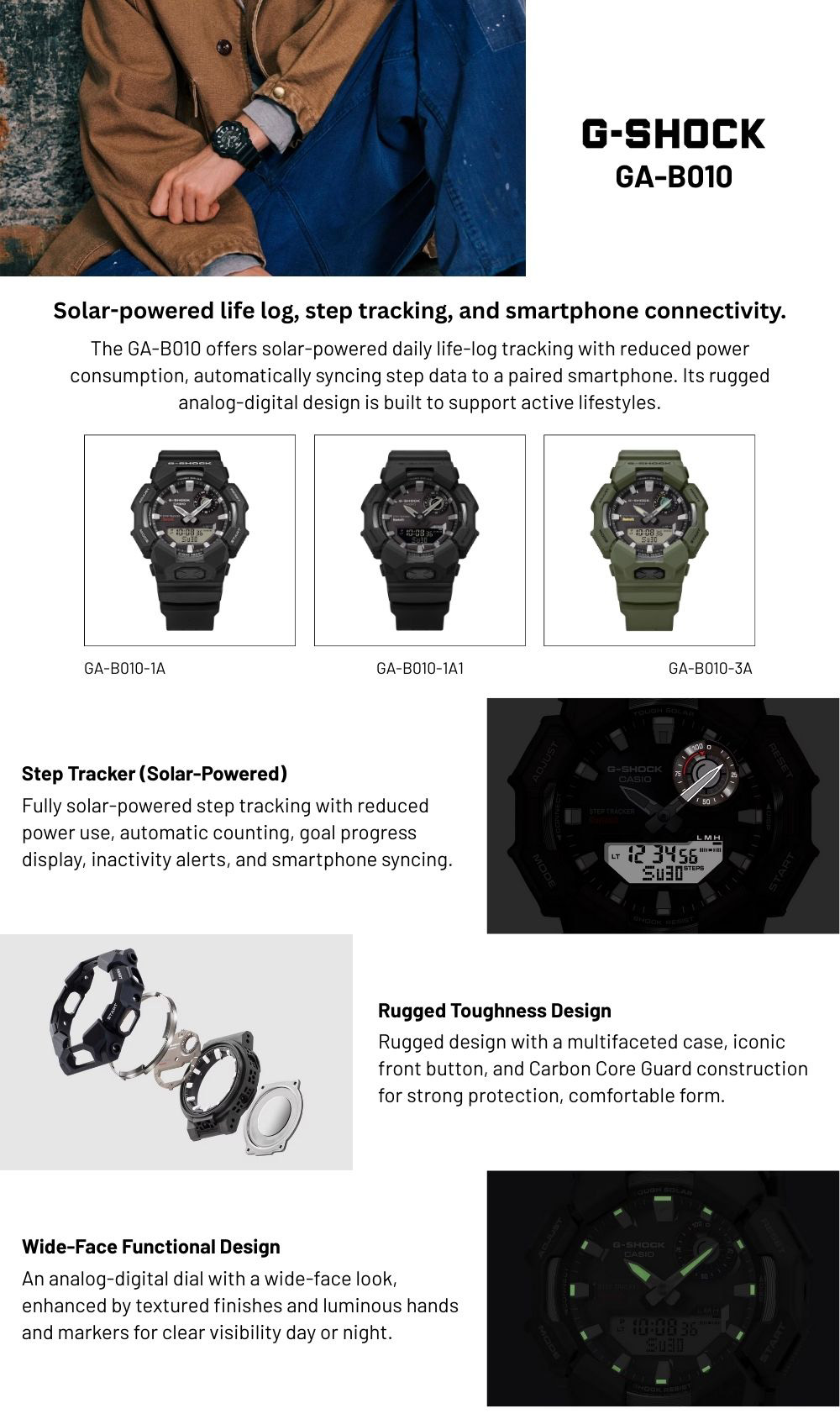 Koleksi G-Shock GA-B010 adalah jam tangan analog-digital yang dirancang untuk penggunaan aktif dengan dukungan teknologi pintar dan daya tahan khas G-Shock. Desainnya modern, fungsional, dan siap dipakai setiap hari tanpa ribet.