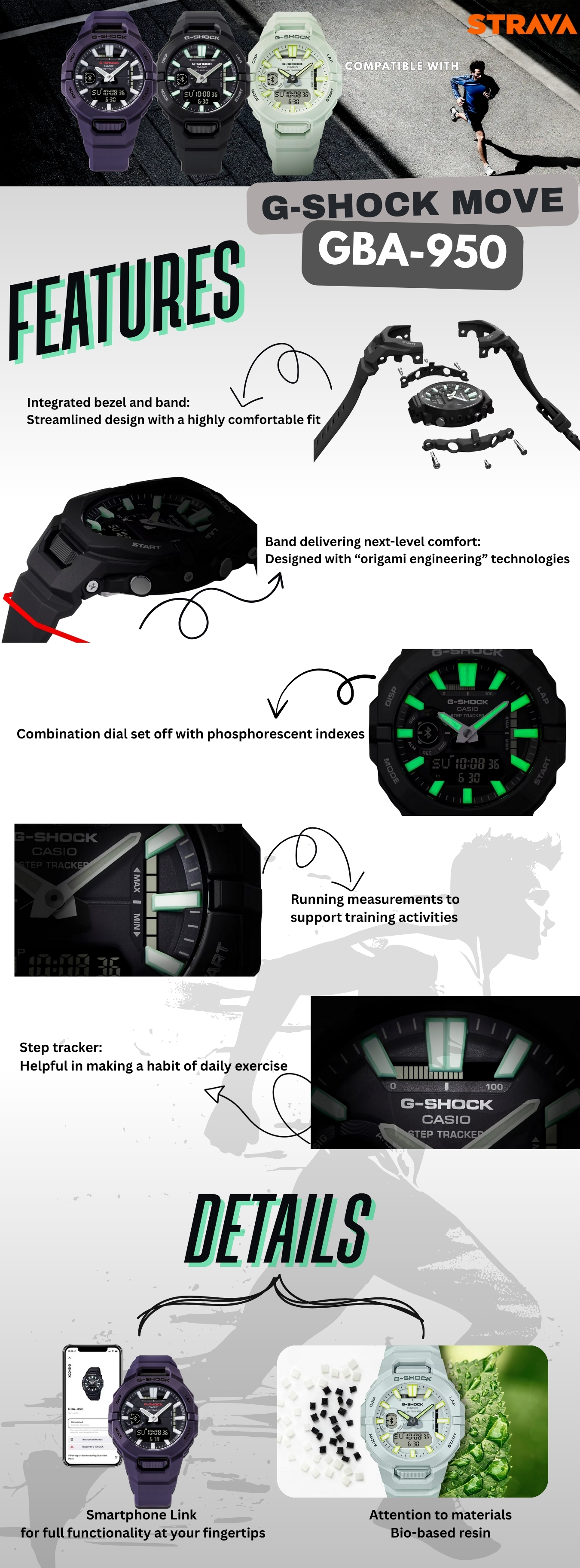 Bukan Cuma Buat Tahu Jam Berapa, Tapi Buat Tahu Seberapa Jauh Kamu Udah Melangkah! Casio G-Shock GBA-950 Didesain khusus untuk kamu yang aktif, dengan material ramah lingkungan dan fitur pelacak latihan yang bikin semangat makin menyala!
