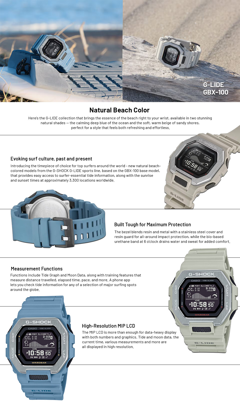 Rasakan sensasi selancar bergaya “beach natural” dengan G-Shock G-Lide GBX-100-2AJF Natural Beach Color. Check out hanya di Jamtangan.com!