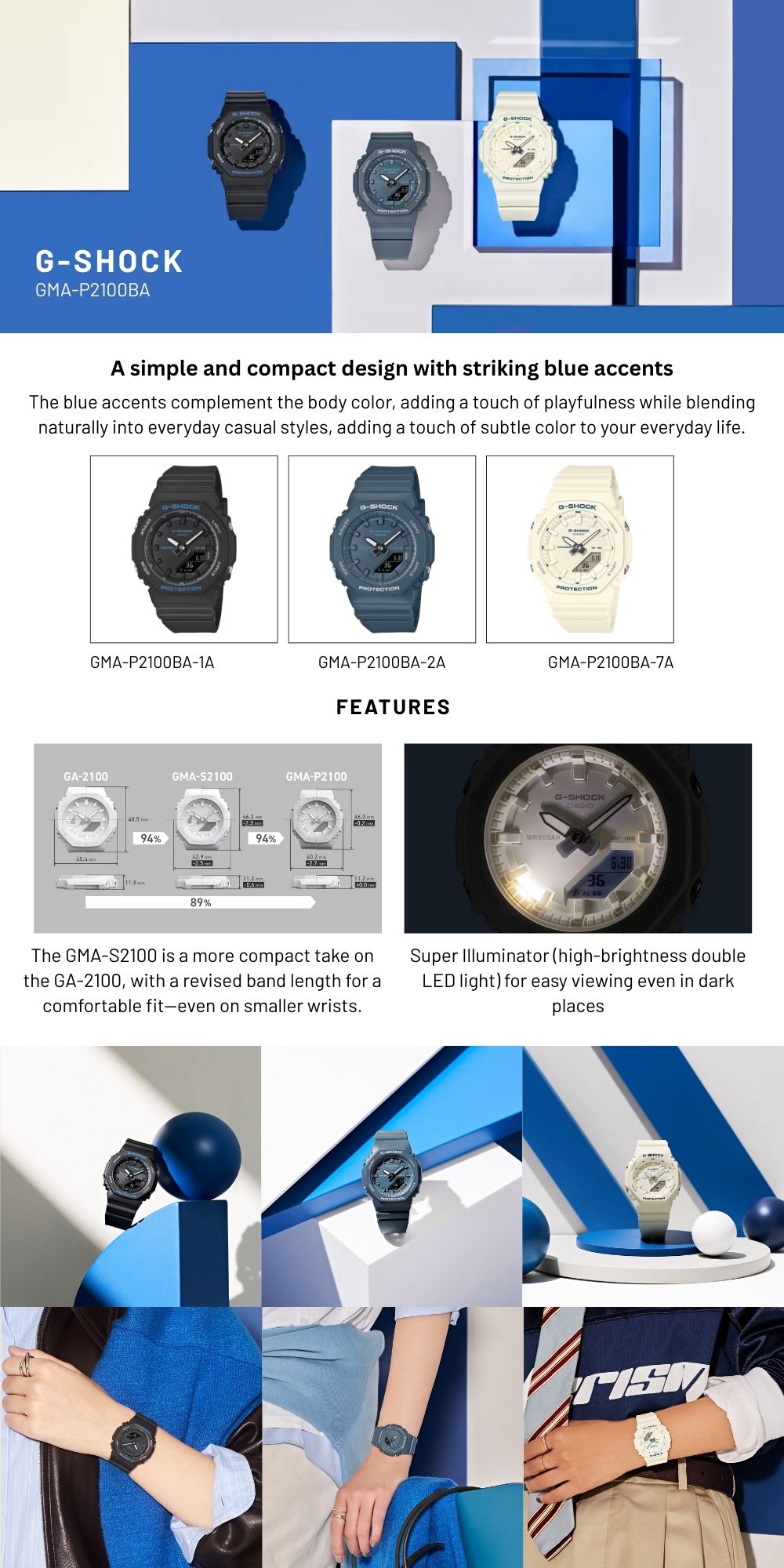 Koleksi G-Shock GMA-P2100BA menghadirkan desain analog-digital ikonis dalam ukuran yang lebih ringkas untuk pergelangan tangan wanita. Siluet octagonal khas G-Shock dipadukan dengan sentuhan warna modern untuk tampilan kasual yang tangguh.