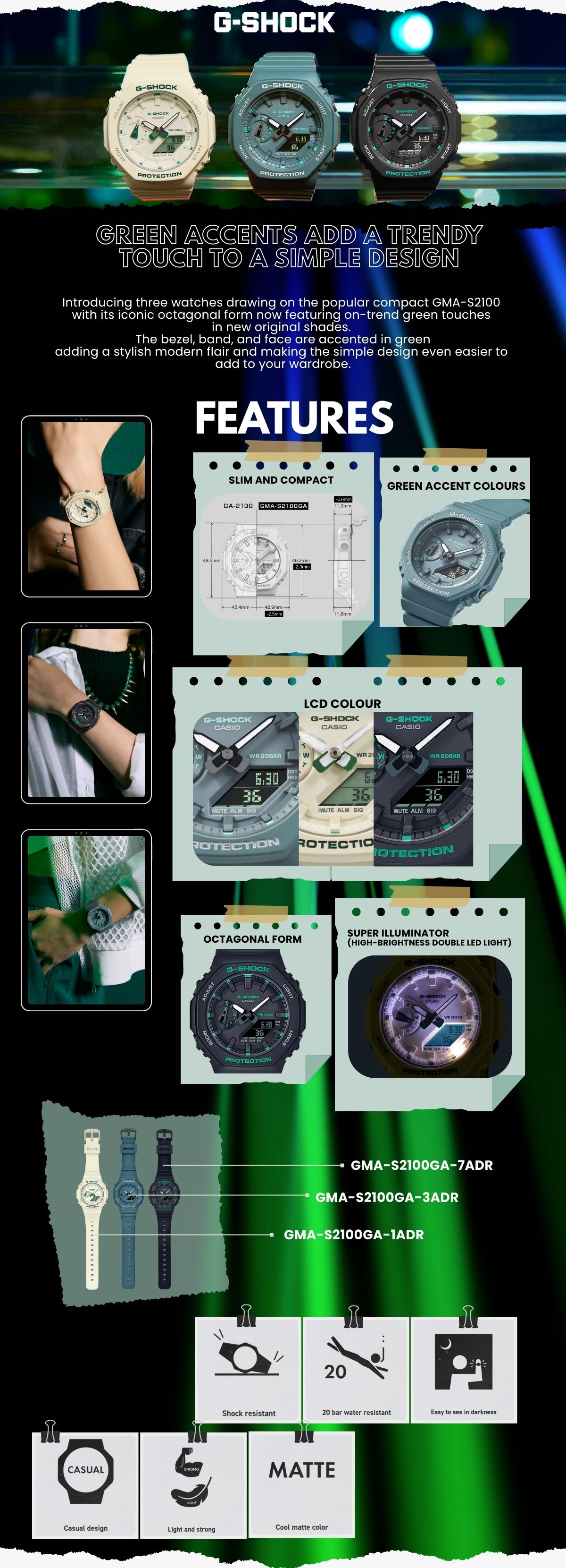 Gaya simpel siap beri pernyataan! Bungkus Casio Women G-Shock GMA-S2100GA-3ADR “CasiOak” Green Accent Series di Jamtangan.com sekarang!