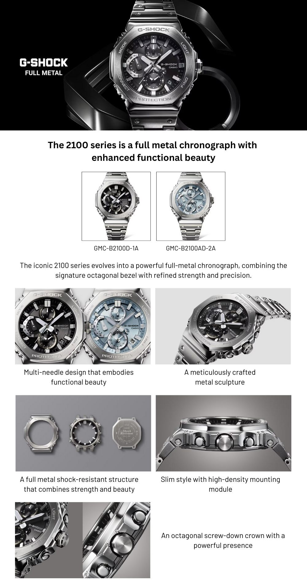 G-Shock GMC-B2100 hadirkan jam tangan full-metal chronograph yang kombinasi antara estetika kokoh dan fungsionalitas modern. Desain oktagonal khas DNA G-Shock klasik dipadukan dengan finishing logam presisi yang menciptakan kesan elegan sekaligus tangguh.