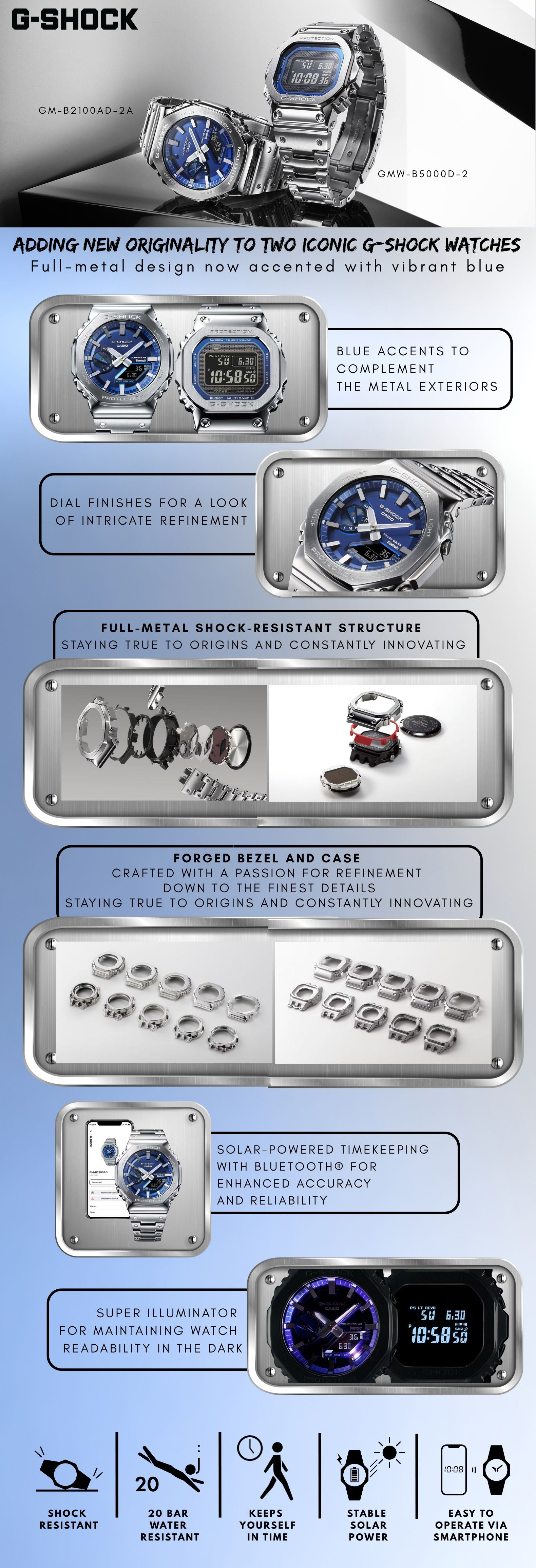 • 1x Casio G-Shock GMW-B5000D-2DR All-Metal Accented with Vibrant Blue Dial Stainless Steel Band