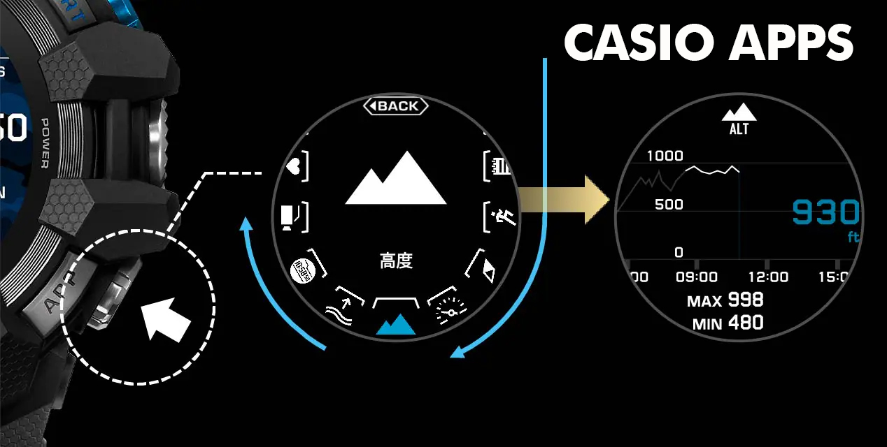 • Measurement range: 260 to 1,100hPa; measurement unit: 1hPa; measurement precision: within ±3hPa; graph of atmospheric pressure change for past 24 hours: graph of atmospheric pressure change during activity; measurement interval: 6 min. (during regular use)/1 min. (during activity); manual atmospheric correction function
