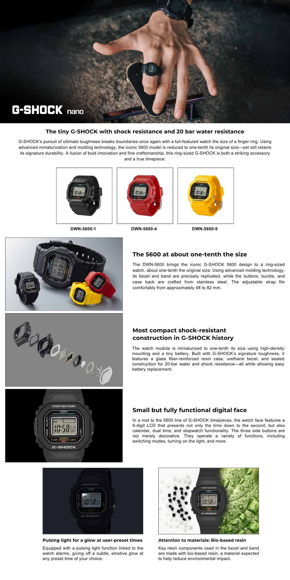 Buktikan sendiri inovasi baru dari G-SHOCK yang membawa ketangguhan legendaris ke dalam bentuk sekecil cincin. Check out G-Shock Nano DWN-5600-9JR dengan harga terbaik hanya di Jamtangan.com!
