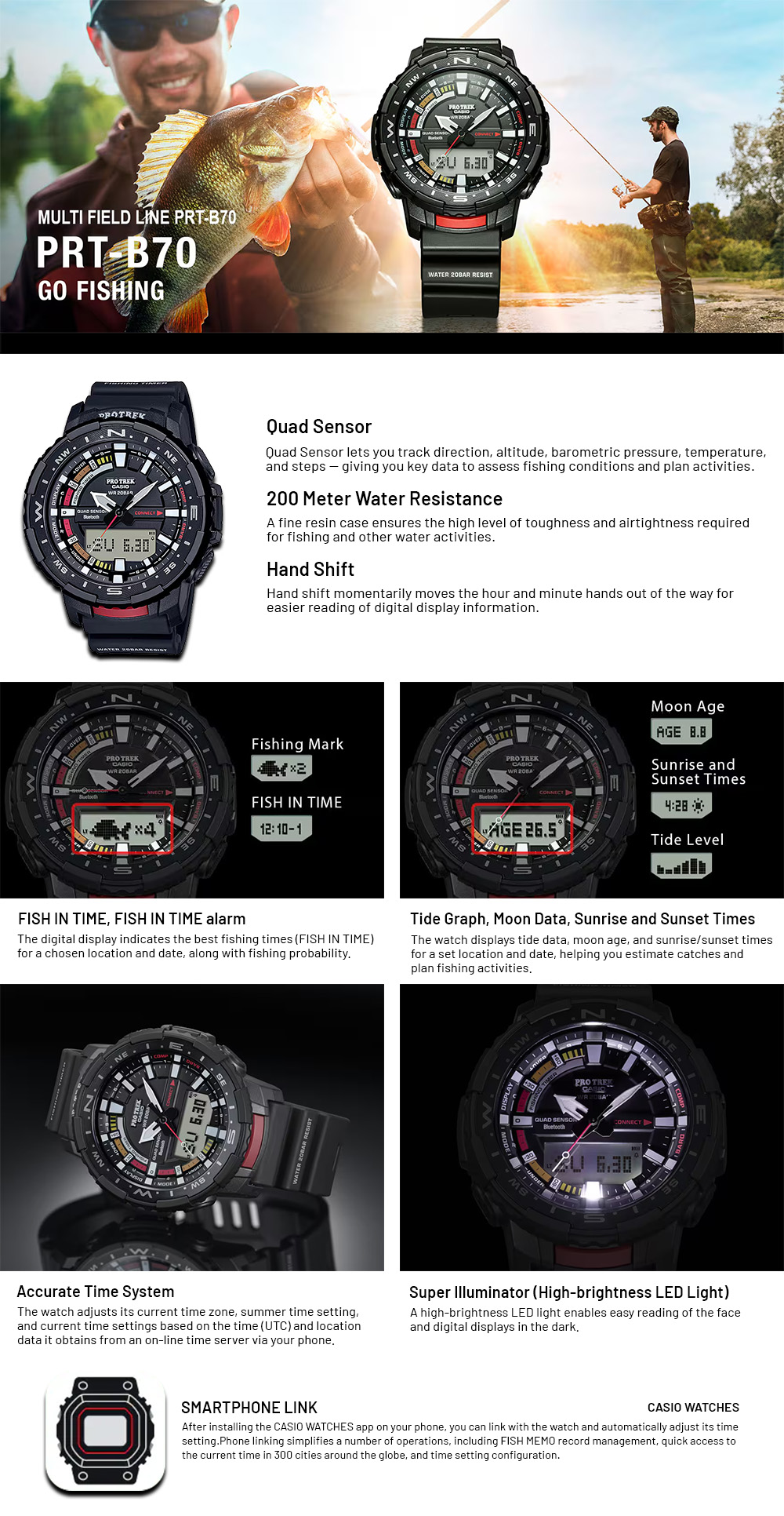 Dengan beragam fitur canggih berikut, Casio Pro Trek PRT-B70-1DR Fishing Edition siap jadi partner terbaikmu saat memancing: