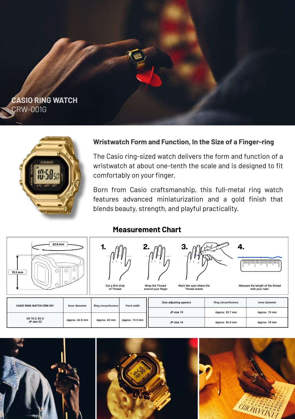 Dirancang dengan inovasi khas Casio, Ring Watch menghadirkan fungsi esensial dalam format cincin yang unik dan lengkap dengan detail berikut: