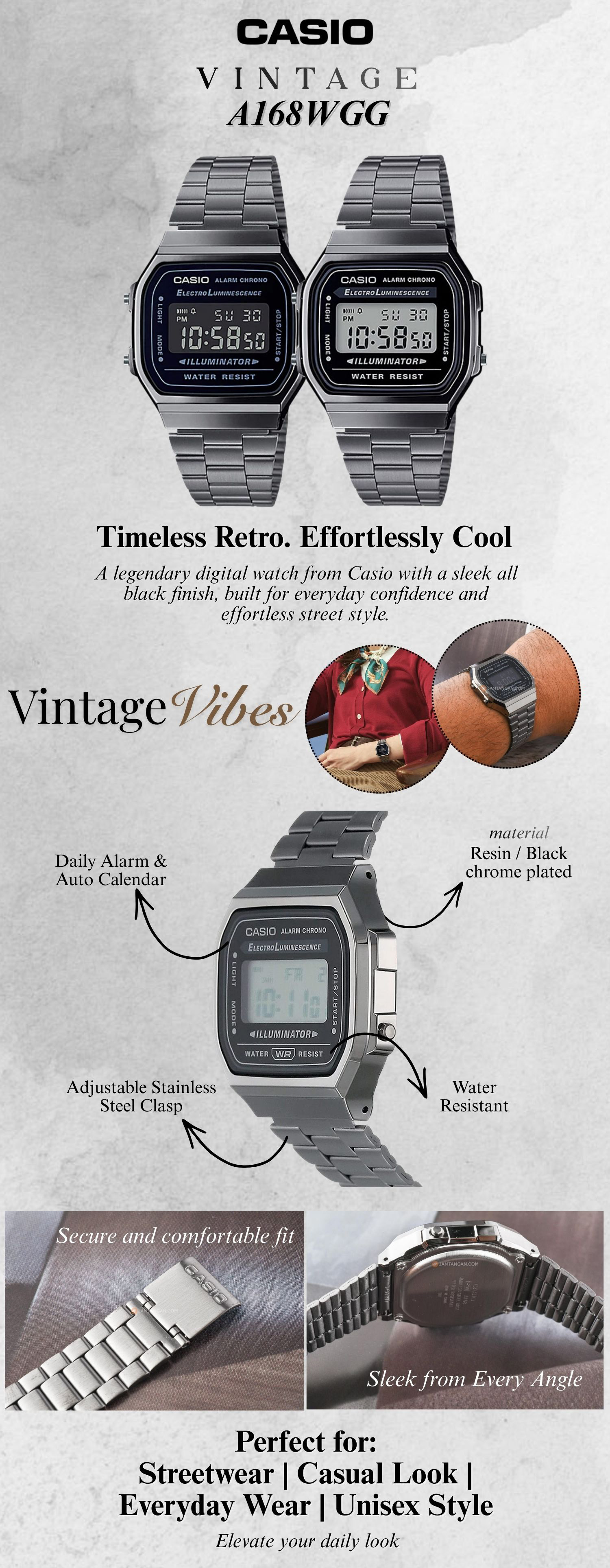 Koleksi retro-vintage berbekal fitur fungsional! Casio A168WGG-1BDF siap jadi andalan untuk aktivitas sehari-hari. Check out sekarang, cuma di Jamtangan.com!