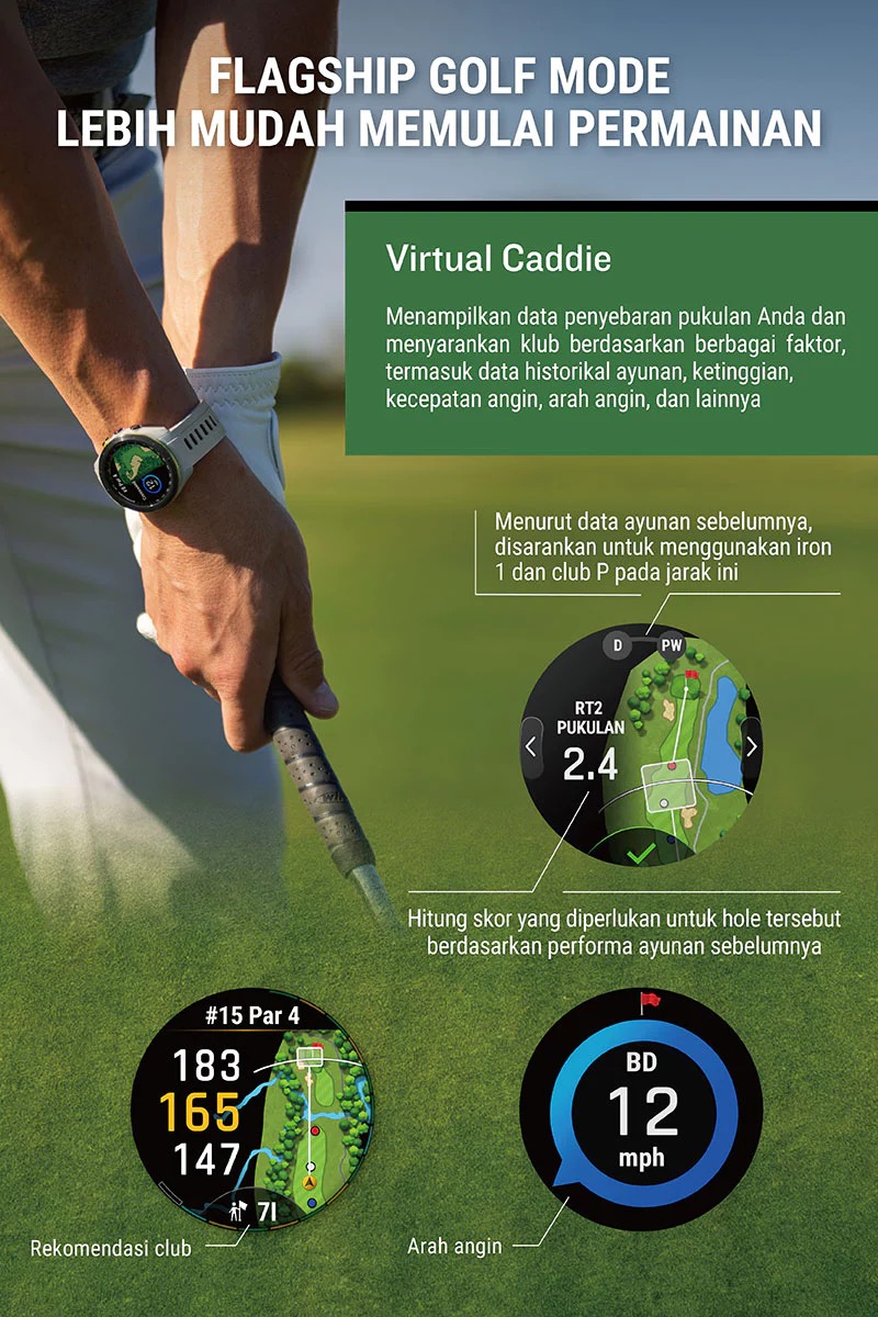 Smartwatch golf premium dengan layar AMOLED tajam, peta 43.000+ lapangan, fitur PlaysLike Distance, dan green contour. Plus, lengkap fitur kesehatan & notifikasi pintar. Stylish dan fungsional!