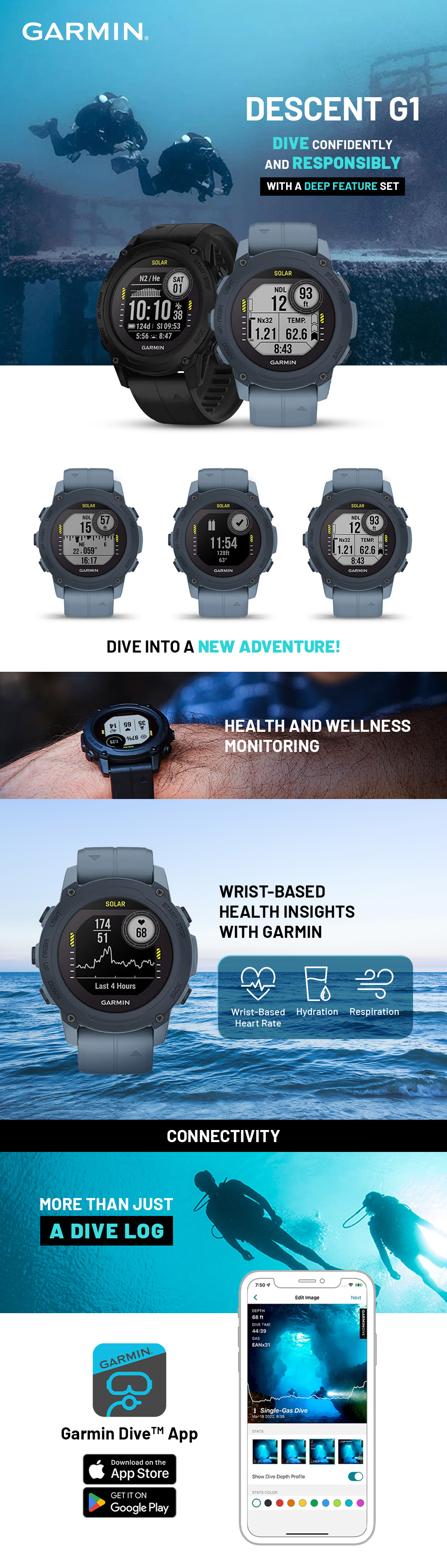 Teknologi selam profesional kini ada di pergelangan tangan. Check out Garmin Descent G1 010-02604-62 dengan harga terbaik hanya di Jamtangan.com!