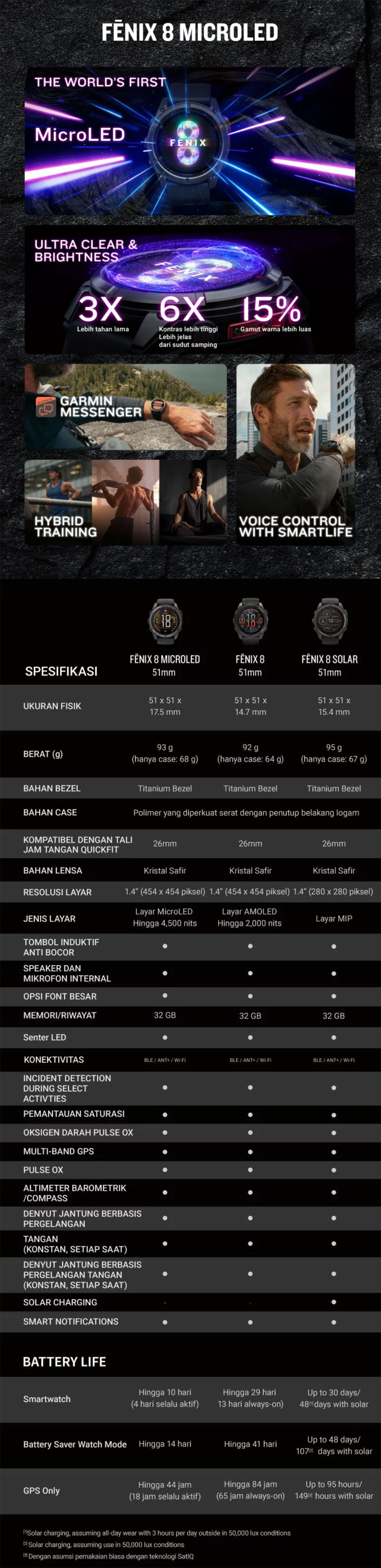 Dirancang untuk performa ekstrem dan konektivitas pintar, Fēnix 8 MicroLED menyatukan teknologi layar mutakhir, pelacakan aktivitas canggih, serta fitur navigasi dan kesehatan yang lengkap.