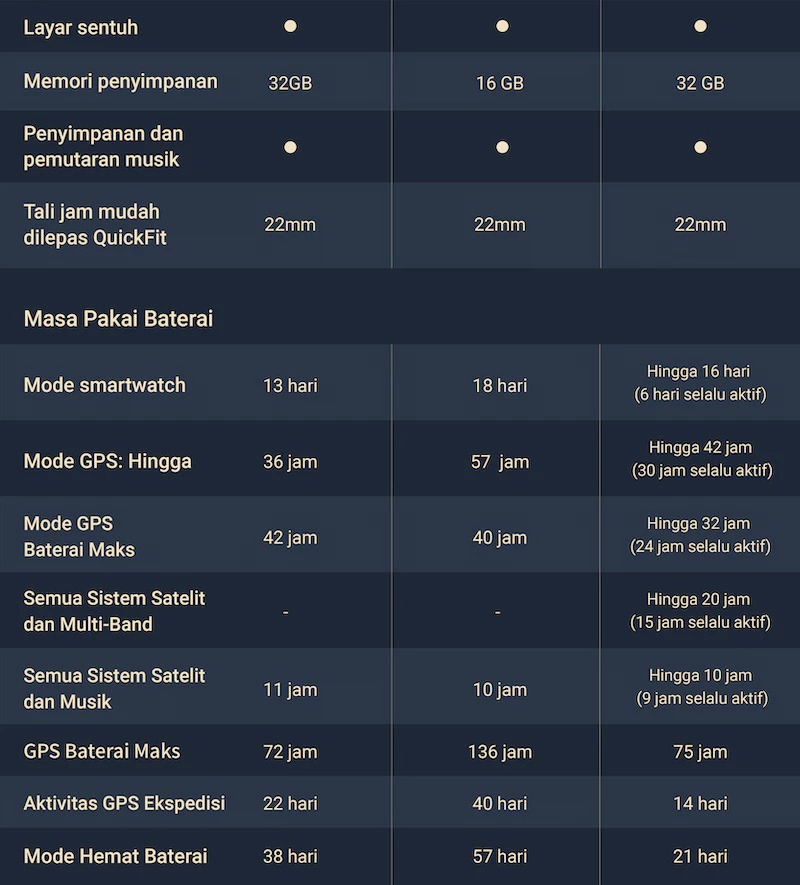 ✅ Daya Tahan Baterai Luar Biasa yang memberikan hingga 16 hari dalam mode smartwatch, 42 jam dalam mode GPS, dan 60 jam dalam mode UltraTrac.