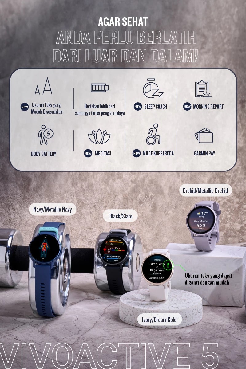 Gaya hidup seimbang dimulai dari pergelangan tangan. Check out Garmin Vivoactive 5 010-02862-5B sekarang, harga terbaik hanya di Jamtangan.com!