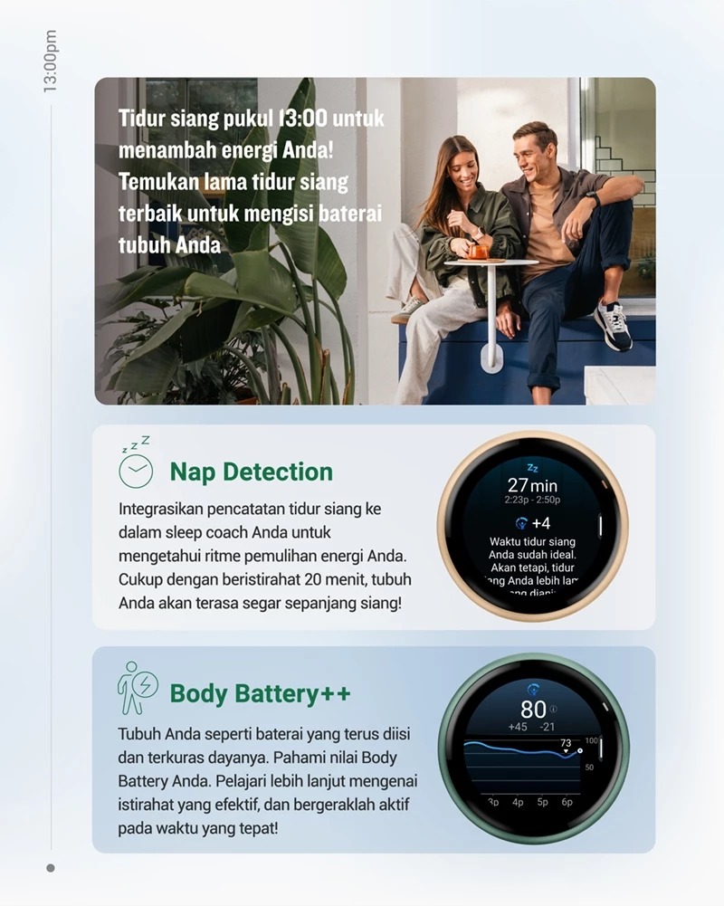 ✅ Fitur kesehatan lengkap: detak jantung, Pulse Ox, HRV, dan lainnya.