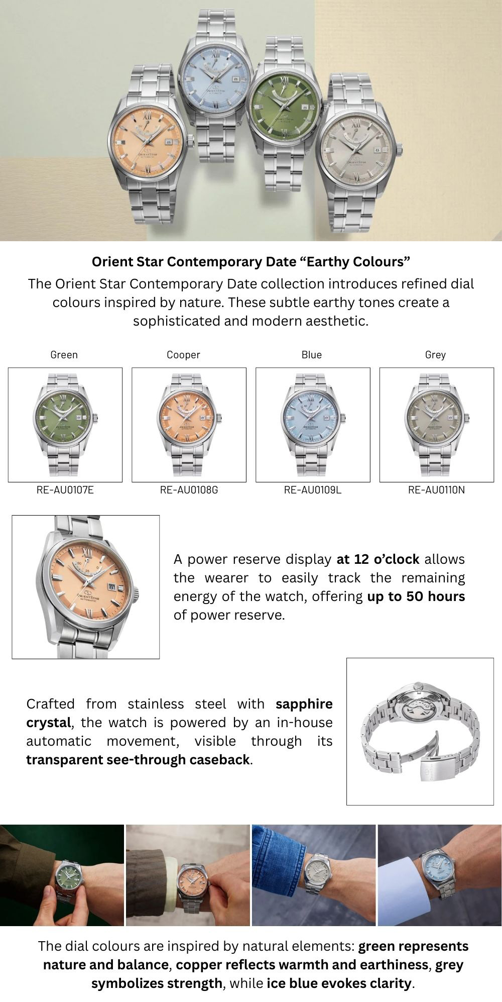 Berikut fitur dan keunggulan yang membuat koleksi Orient Star Contemporary Date Standard Collection “Earthy Colours” cocok untuk berbagai gaya dan keadaan: