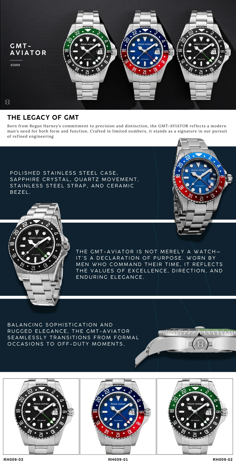 Ambil kendali perjalananmu dan bawa Regan Harney RH009-03 GMT Aviator melekat di pergelangan tangan, siap memandu ke mana pun langkah