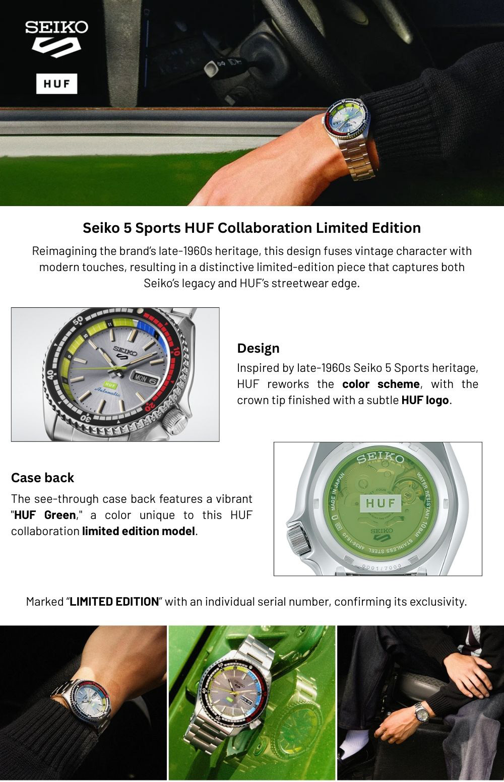 ✅ Desain heritage Seiko 5 Sports dengan sentuhan warna khas HUF.
