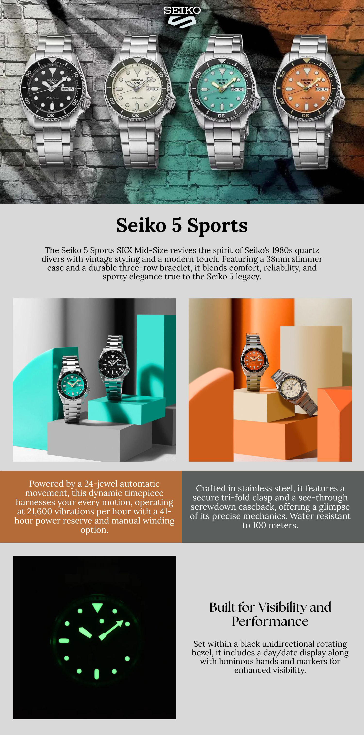 Rasakan perpaduan warisan dan gaya modern melalui Seiko 5 Sports Style SKX Series 38 mm, kini tersedia di Jamtangan.com. Miliki segera dan tampil dengan pesona sporty klasik yang tak lekang oleh waktu.