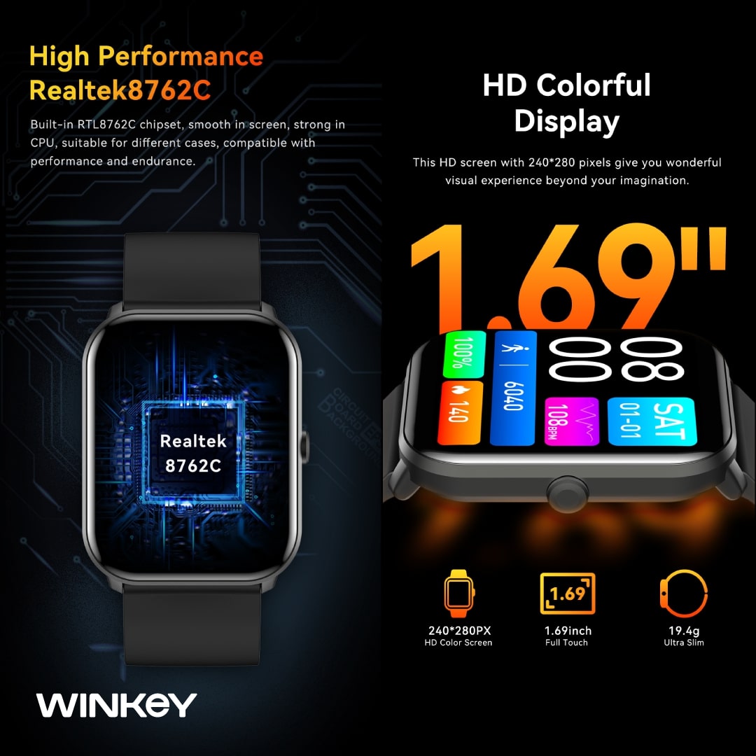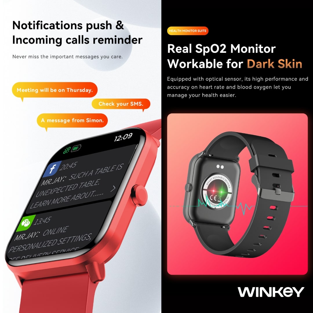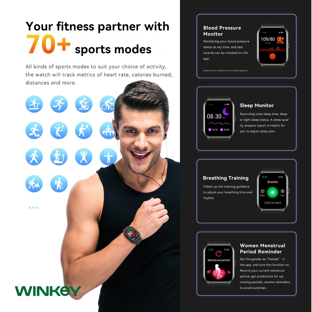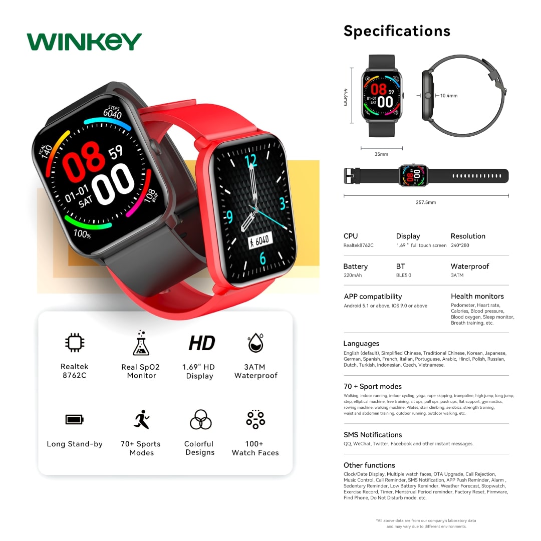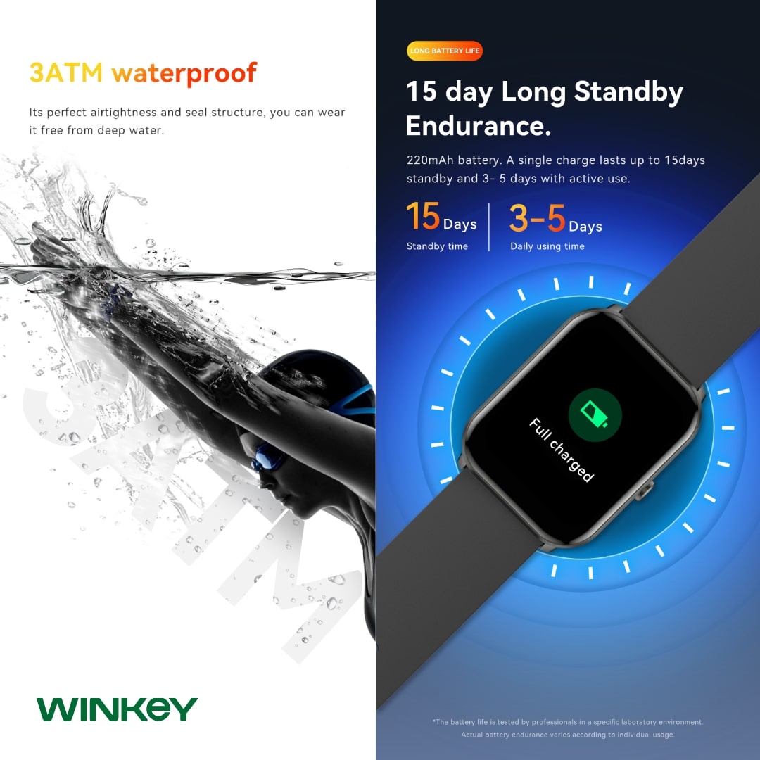 WINKEY Zeta SWW02 Smartwatch 3ATM Long Battery Life 60+ Sport Modes Black Rubber Strap